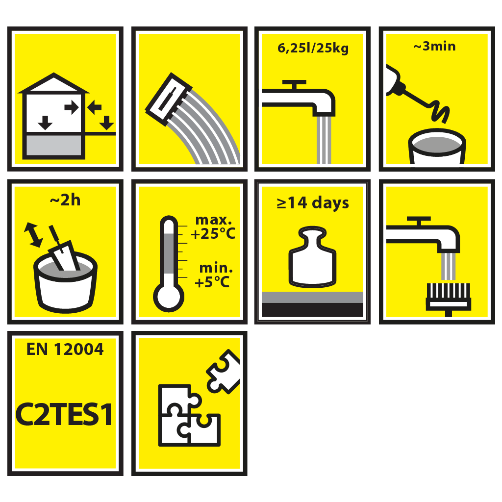 | ~ 20 min. | 1,8 kg | 2,7 kg | 3,5 kg | 4,5 kg | LVS EN 12004 | Pēc ~ 24 h | Eiroklase A1 (nedegošs) | 12 mēneši | Cements, speciālās inertās piedevas, palīgvielas un palīgmateriāli apstrādes īpašību uzlabošanai |