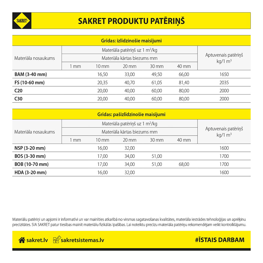 Ieskaties, kāds ir SAKRET grīdu pašizlīdzinošo un izlīdzinošo maisījumu patēriņš!