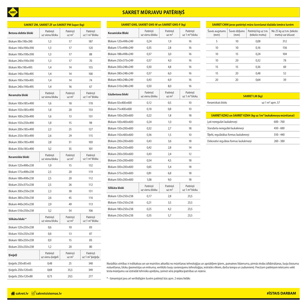 Ieskaties, kāds ir SAKRET mūrjavu patēriņš (3. lapa): https://sakret.lv/wp-content/uploads/2026/03/Produktu-paterins.pdf!